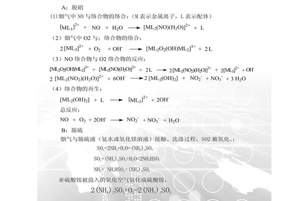 濕法煙氣脫硝技術的原理是通過液相絡合劑把煙氣中的NO絡合,從而增加了NO在吸收液中的溶解度,利用煙氣中的氧氣再把絡合下來的NO氧化成易溶于水的NO2,與堿性吸收劑(如氨、氧化鎂等)反應生成硝酸鹽,通過回收形成硝酸鹽產品。